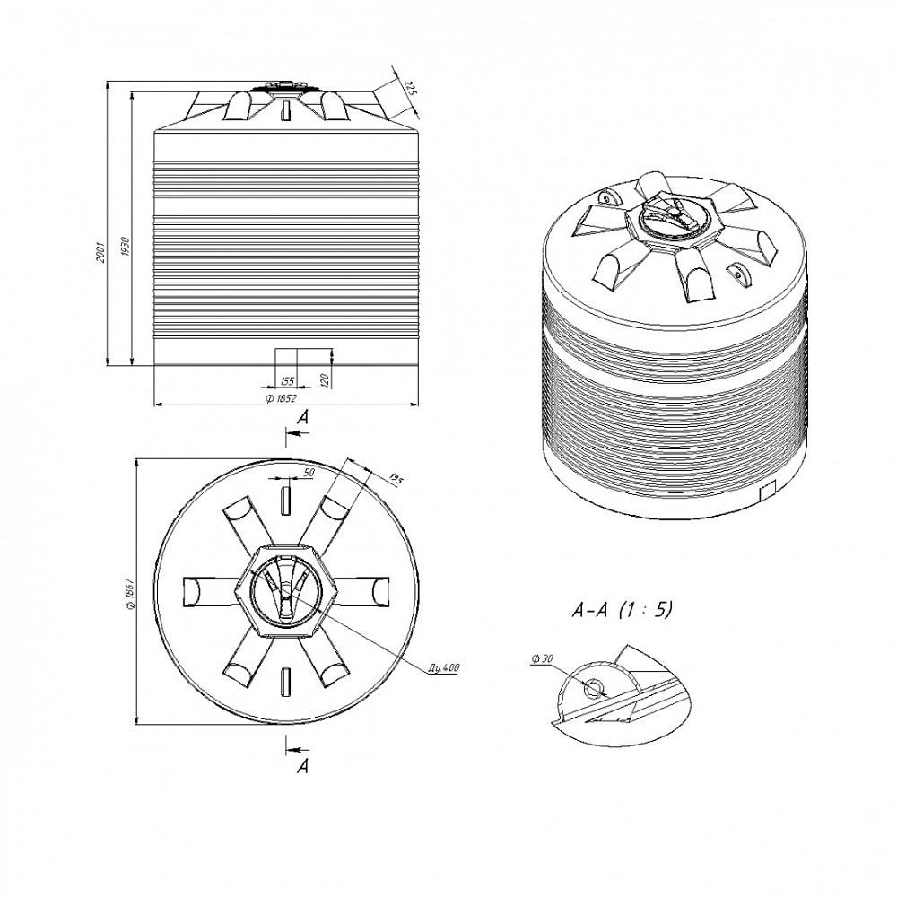 емкость, для воды / для дизельного топлива, форма емкости: цилиндрическая, тип эксплуатации: наземная, расположение: вертикальное, тип крышки: откидная, плотность вещества макс.: 1 г/куб. см, объем 5 000 л