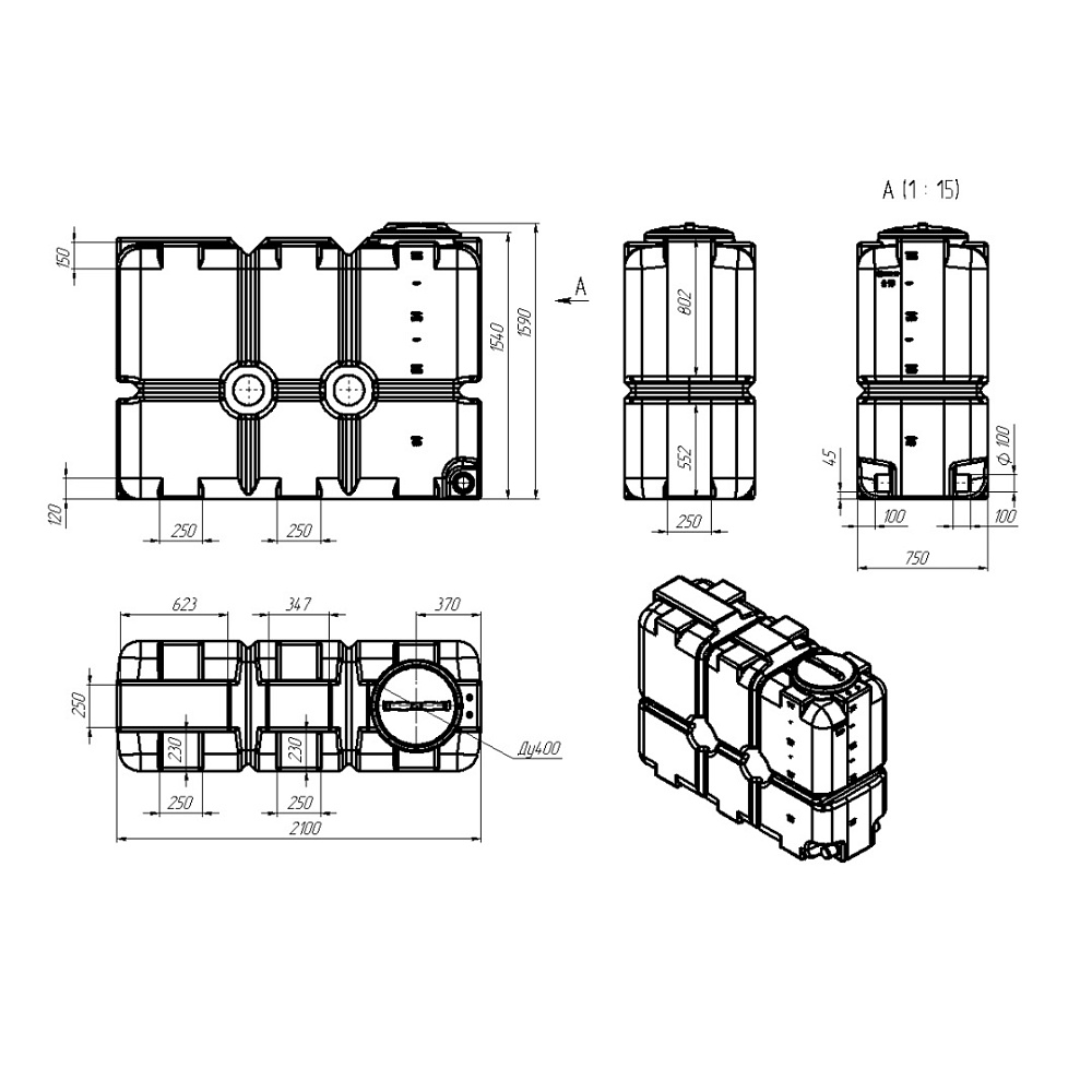 емкость, для воды / для дизельного топлива, форма емкости: прямоугольная, тип эксплуатации: наземная, расположение: горизонтальное / вертикальное, тип крышки: откидная, плотность вещества макс.: 1 г/куб. см, объем 2 000 л, диаметр патрубка: 100 мм