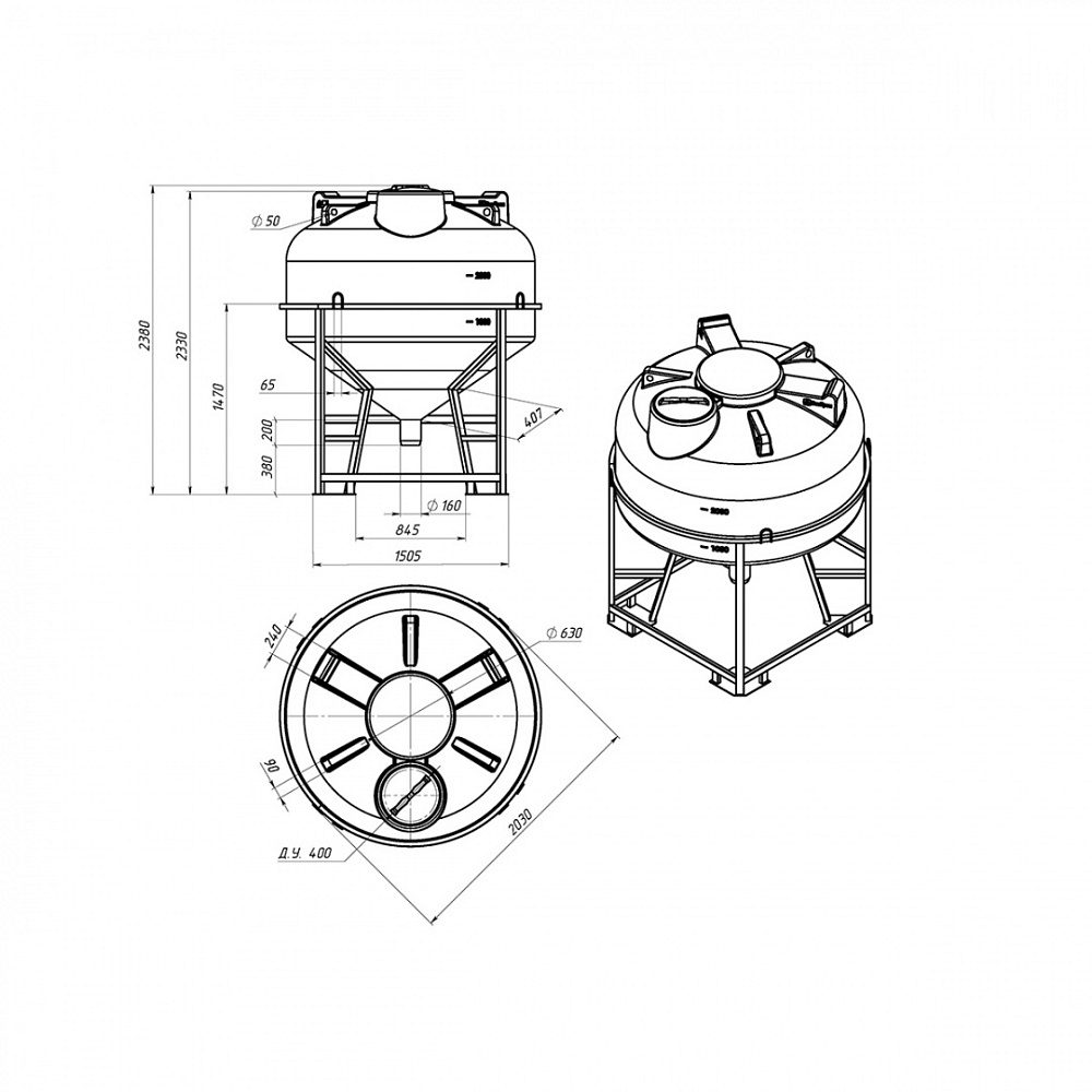 емкость, для воды / для дизельного топлива / для сыпучих, форма емкости: конусообразная, тип эксплуатации: в обрешетке, расположение: вертикальное, тип крышки: резьбовая, плотность вещества макс.: 1 г/куб. см, объем 3 000 л, диаметр патрубка: 160 мм