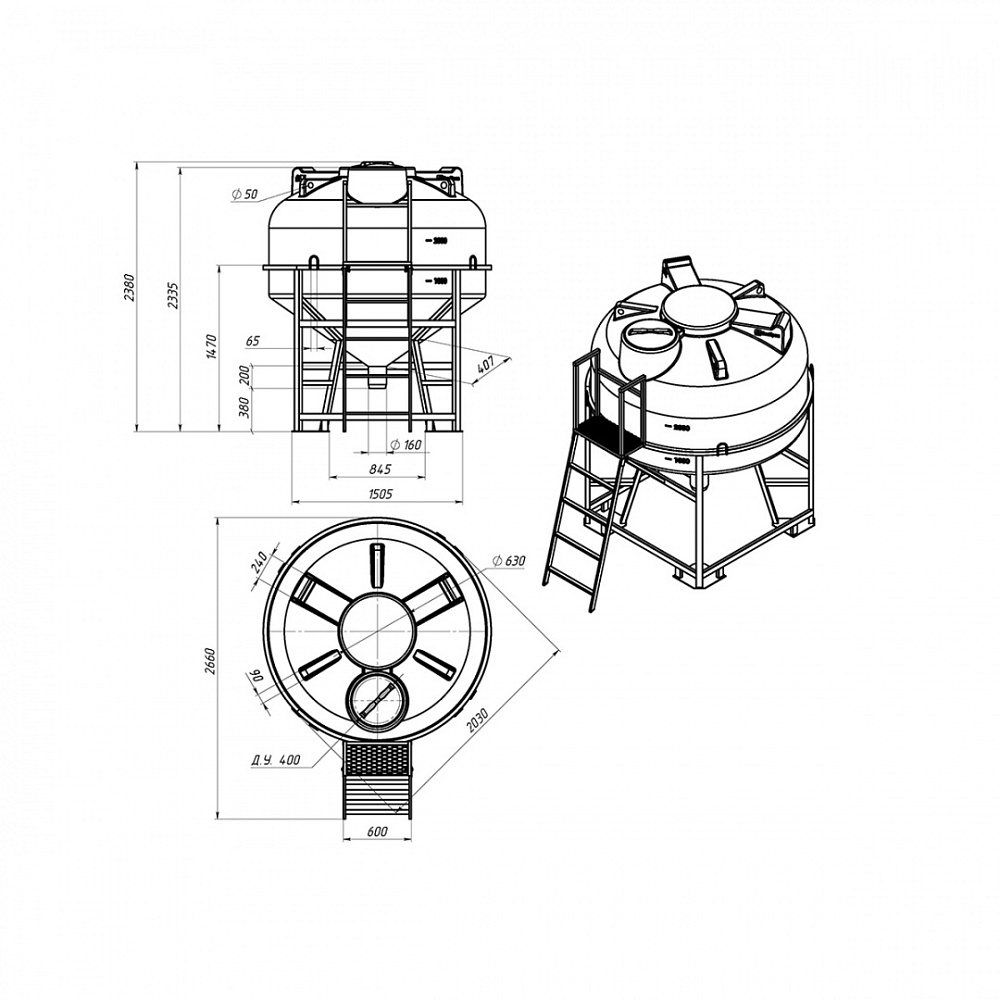 емкость, для воды / для дизельного топлива / для сыпучих, форма емкости: конусообразная, тип эксплуатации: в обрешетке, расположение: вертикальное, тип крышки: резьбовая, плотность вещества макс.: 1 г/куб. см, объем 3 000 л, диаметр патрубка: 160 мм