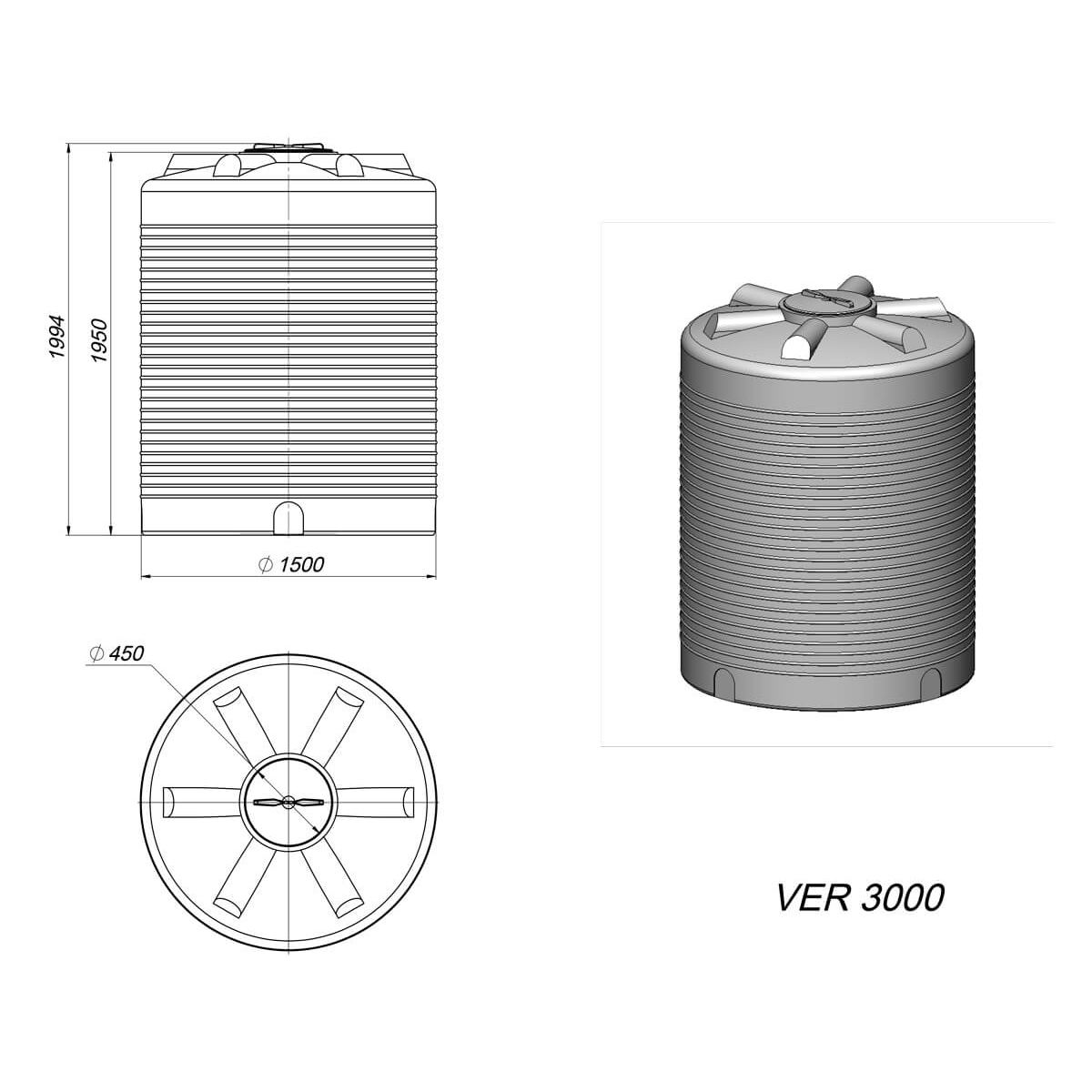 емкость, объем: 3 000 л, форма емкости: цилиндрическая, тип эксплуатации: наземная, расположение: вертикальное, диаметр горловины: 40 см, материал: полиэтилен